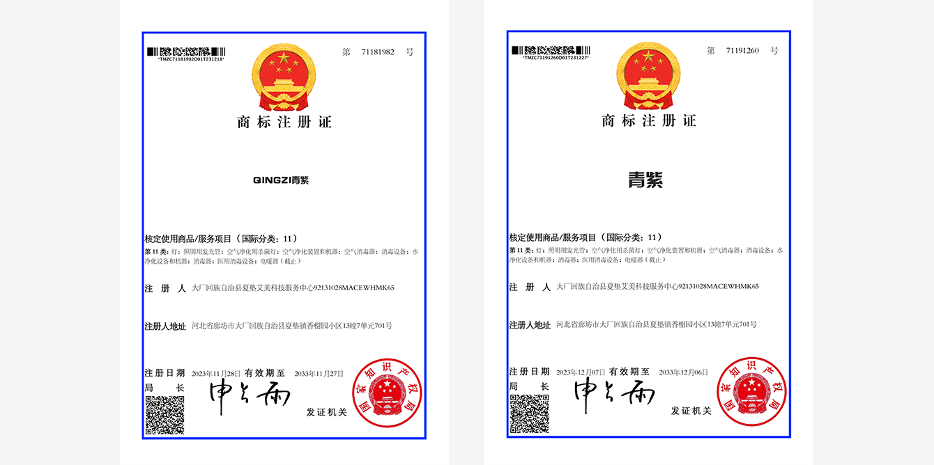 随着我公司业务不断推进发展,为满足公司品牌战略及市场发展需要,提升品牌竞争力,响应国家保护知识产权的号召,我司设计的品牌标示经过国家工商行政管理总局商标局的受理、初审、公审等一系列法定程序,青紫商标正式获得11类商标注册证书。